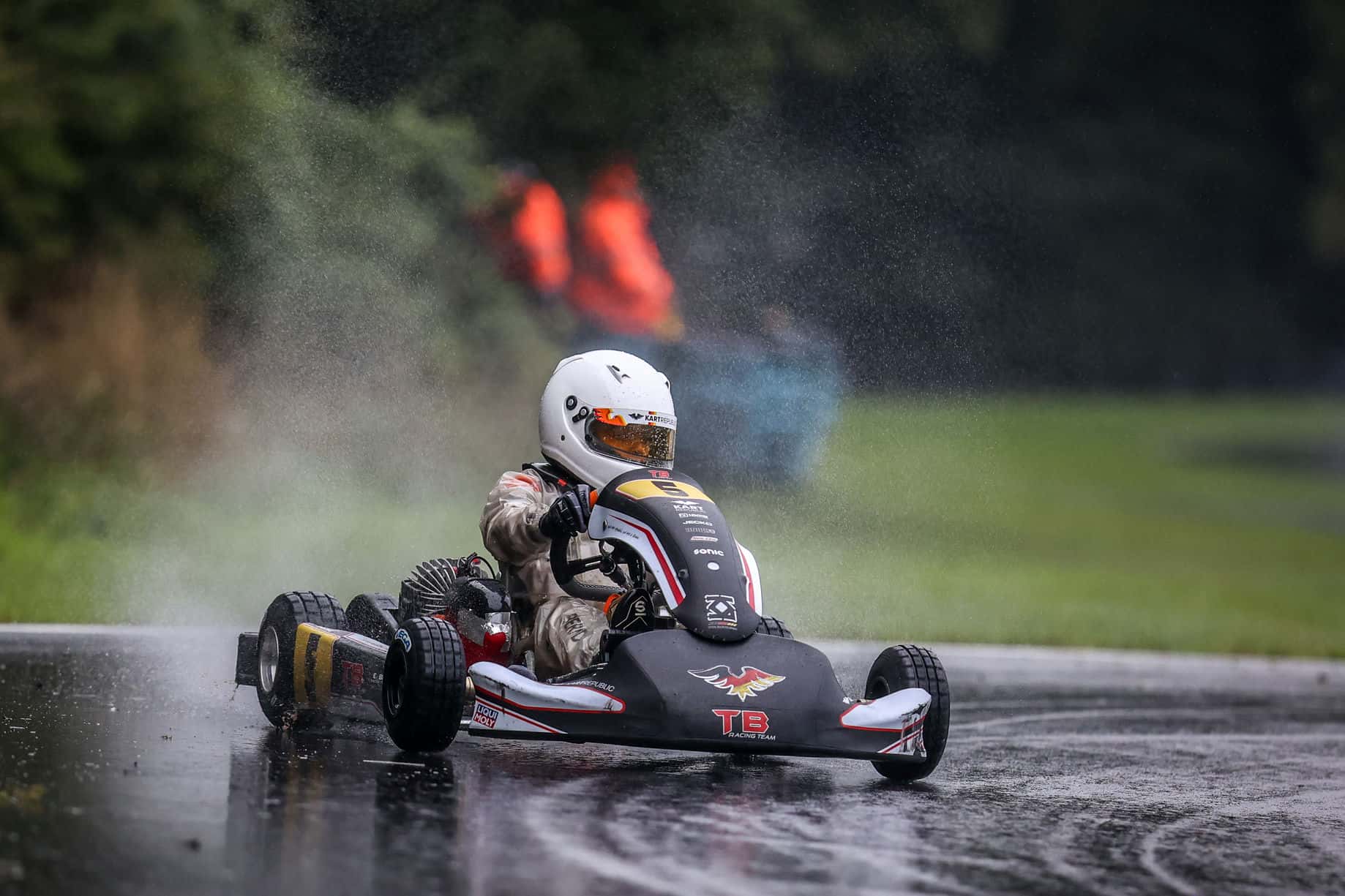 Der Start zum ersten Lauf wurde dann fast zu totalen Desaster. Emilio rutschte auf regennasser Fahrbahn von der Bahn und konnte sich gerade so wieder in das Rennen retten. Außerhalb der Punkte liegend war das große Ziel plötzlich wieder in weite Ferne gerückt! Doch Emilio bewies Nervenstärke und Kampfesgeist. Unbeeindruckt von dem auf ihm lastenden Druck fuhr er sich zurück auf Position 12 und damit in die Punkteränge. Der zweite Lauf musste entscheiden, ob Emilio vorzeitig Meister wird oder nicht. Und er tat es auf kuriose Art und Weise. Wie fast immer waren es die Wetterkapriolen, die in Kerpen den Fahrern einen Streich spielten. Dieses Mal setzte nach dem ersten Rennen massiver Starkregen ein, der die Bahn unbefahrbar machte und den Rennleiter zum Abbruch der Veranstaltung zwang. Da die Konkurrenz dadurch keine Möglichkeit mehr bekam eventuell Punkte auf Emilio gut zu machen, stand am Sonntagmittag Emilio Bernd als neuer Meister des ADAC Kart Masters 2023 fest!
